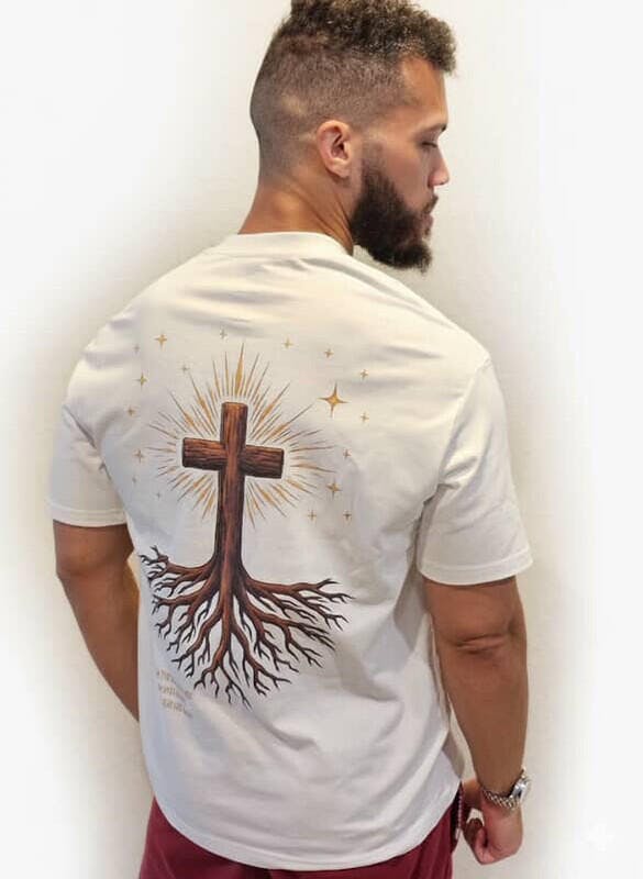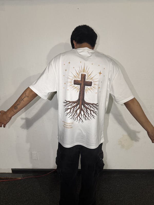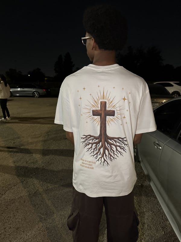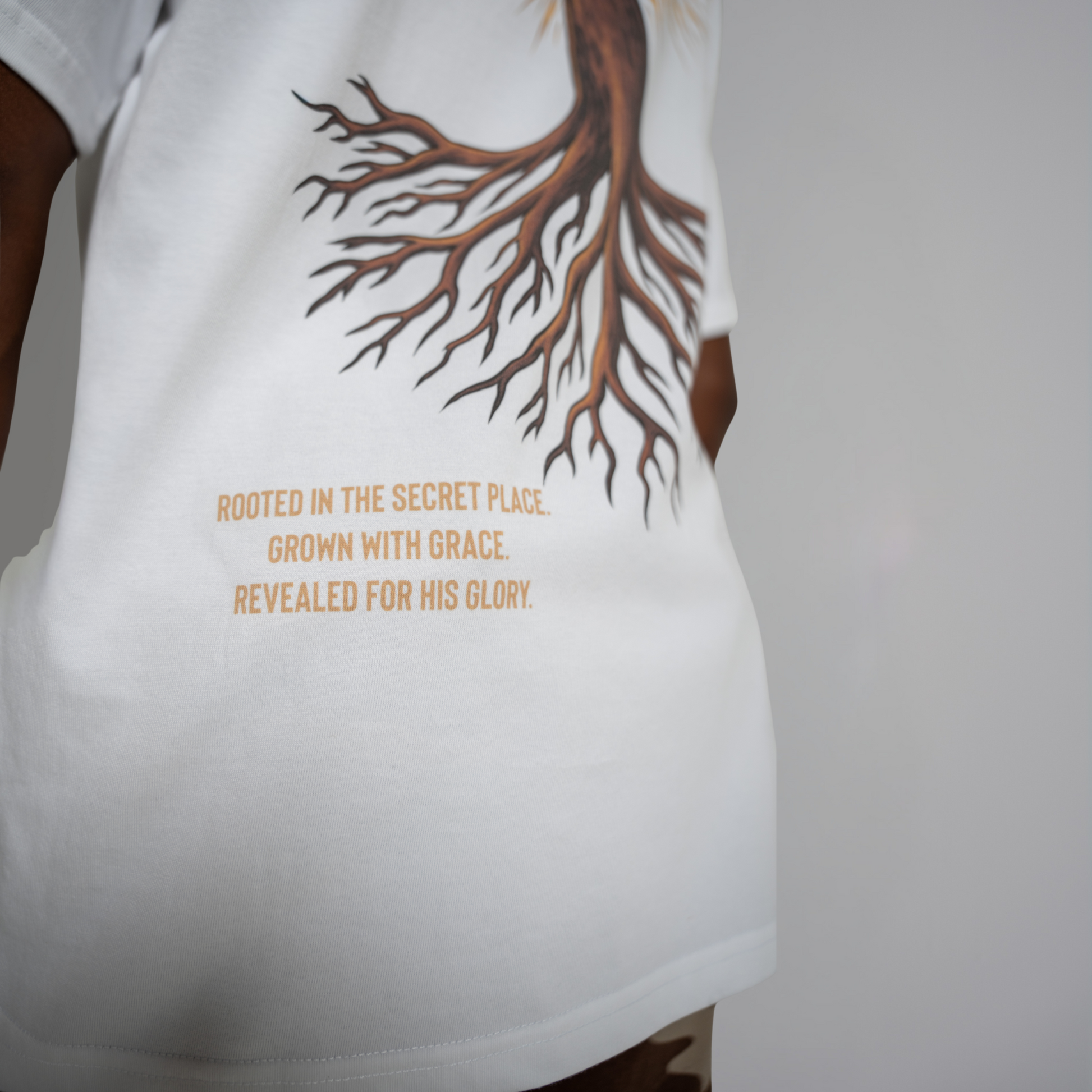 This tee is inspired by the Holy Spirit. It tells your story of being and continuing to be rooted in the secret place with God, allowing Him to use you wherever He sends you to reveal His glory.